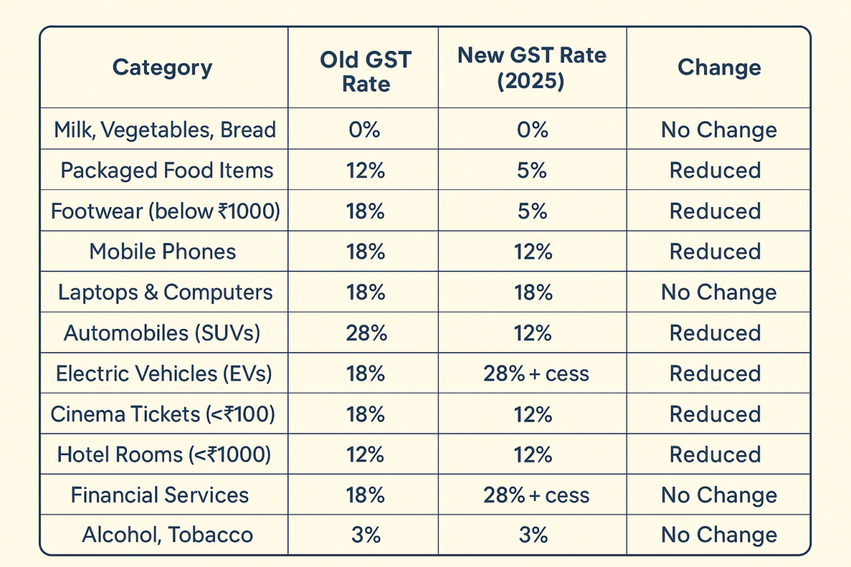 | Category | Old GST Rate | New GST Rate (2025) |